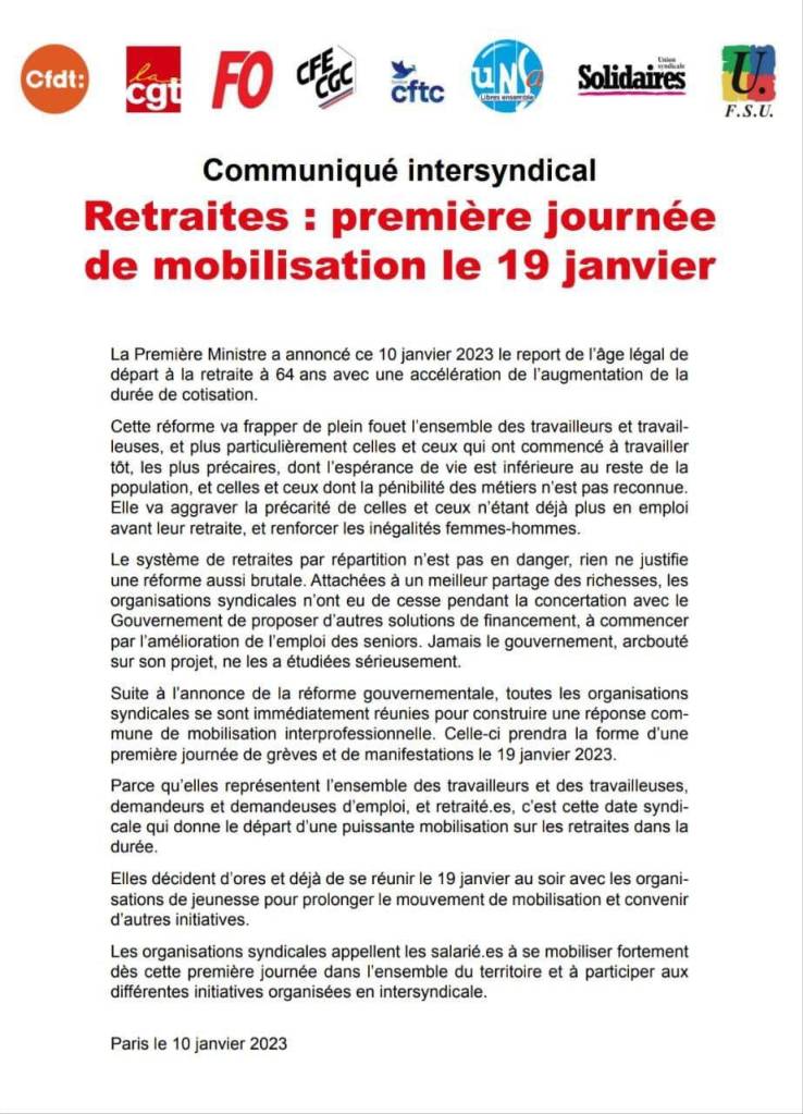 nous mettons en ligne le communiqué intersyndical appellant à un mouvement de grève le 19/01/23 contre la nouvelle réforme des retraites.